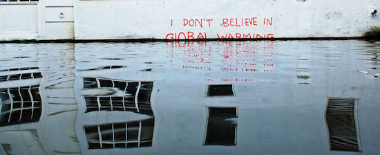 Par exemple, en 2008, le graffeur Banksy a graffé en lettres capitales rouges : « I don’t believe in global warming », sur un mur du Regent’s Canal à Londres. Cette œuvre, à moitié submergée par l’eau, est la réponse de l’artiste de rue au sommet des Nations Unies sur le climat à Copenhague (2009) où des pays comme les États-Unis, la Chine et le Brésil ne se sont pas engagés à prendre des mesures pour lutter contre le réchauffement climatique. Avec son sarcasme légendaire, Banksy a ainsi réagi à l’absurdité de la négation des enjeux environnementaux de la part des grandes puissances mondiales.